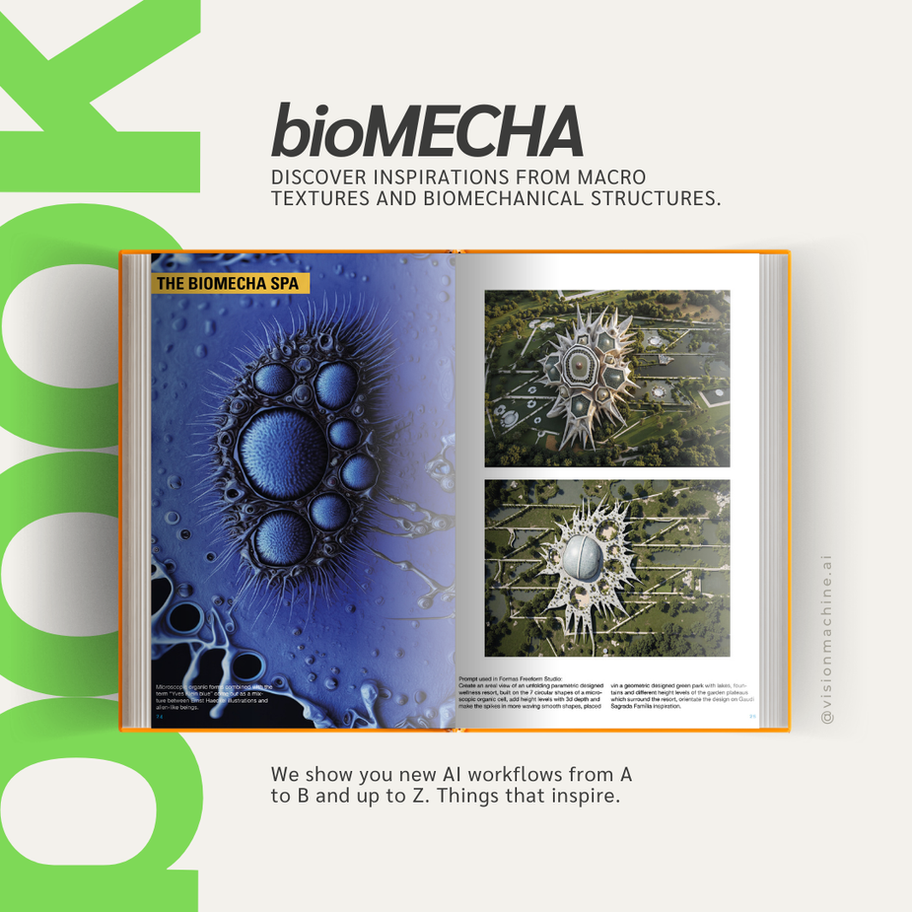 “Form follows function” is turned on its head when we combine biology and visual AI aesthetics. It´s neither strictly organic nor strictly engineered. Instead, it exists as in-between space where organic forms can become something new, a series of case studies showing how to train creative thinking in new ways, transforming technical innovations to a new striking visual language. This book takes you on a journey of AI-generated bio-mechanical structures on 135 pages - a beginning to reshape the way researchers, architects, designers, and creatives could understand and use form and function. From textures over fashion design to urban architectural concepts and Reverse AI techniques, a perfect guide for creativity training.